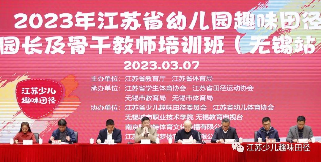 为响应江苏省委办公厅、江苏省政府办公厅印发的《关于全面加强和改进新时代学校体育工作实施意见的通知》,将“学前教育阶段广泛开展趣味田径幼儿体适能游戏活动”列为重点任务,贯彻落实《省教育厅省体育局关于推广少儿趣味田径运动项目的通知》,综合施策建好师资队伍,切实提高教师的专业知识和执教能力。3月7日,江苏省幼儿园趣味田径园长及骨干教师培训班(无锡站)在无锡城市职业技术学院举办,来自全市165名幼儿园园长及骨干教师参加本次培训。江苏省教育厅体卫艺处处长 张鲤鲤;江苏省社会体育管理中心主任、江苏省田径运动协会会长 孙谦;江苏田协少儿趣味田径委员会主任、江苏省幼儿体育协会副会长兼秘书长 姜迪;江苏省教育厅体卫艺处主任科员 李扬以及无锡市教育局副局长 任克奇;无锡市体育局副局长 太铁斌;无锡城市职业技术学院党委副书记 俞力元出席开班仪式。此次培训由无锡市教育局体育卫生与艺术教育处副处长 杨永立主持。
