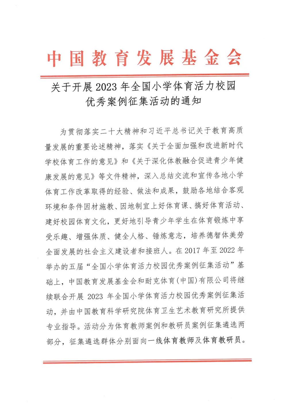 为贯彻落实二十大精神和习近平总书记关于教育高质量发展的重要论述精神,落实《关于全面加强和改进新时代学校体育工作的意见》和《关于深化体教融合促进青少年健康发展的意见》等文件精神,深入总结交流和宣传各地小学体育工作改革取得的经验、做法和成果,鼓励各地结合客观环境和条件因材施教、因地制宜上好体育课、搞好体育活动、建好校园体育文化,更好地引导青少年学生在体育锻炼中享受乐趣、增强体质、健全人格、锤炼意志,培养德智体美劳全面发展的社会主义建设者和接班人。在2017年至2022年举办的五届“全国小学体育活力校园优秀案例征集活动”基础上,中国教育发展基金会和耐克体育(中国)有限公司将继续联合开展2023年全国小学体育活力校园优秀案例征集活动,并由中国教育科学研究院体育卫生艺术教育研究所提供专业指导。