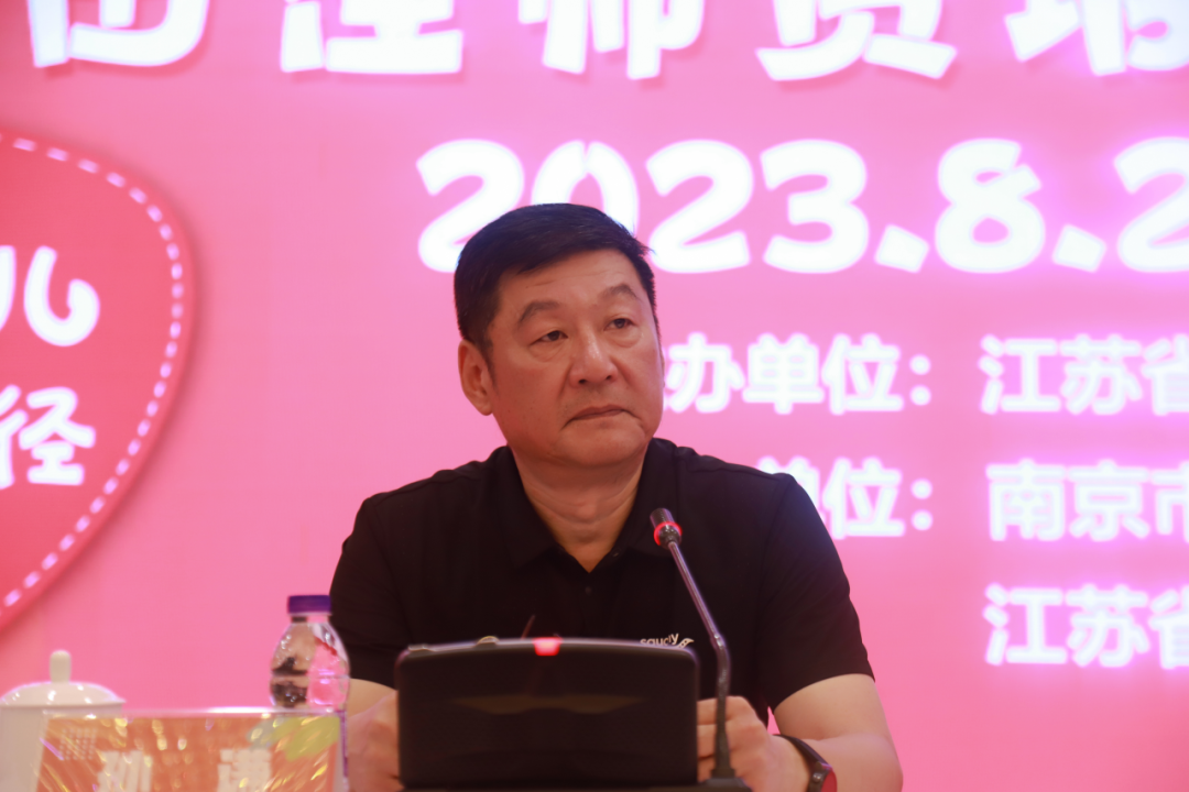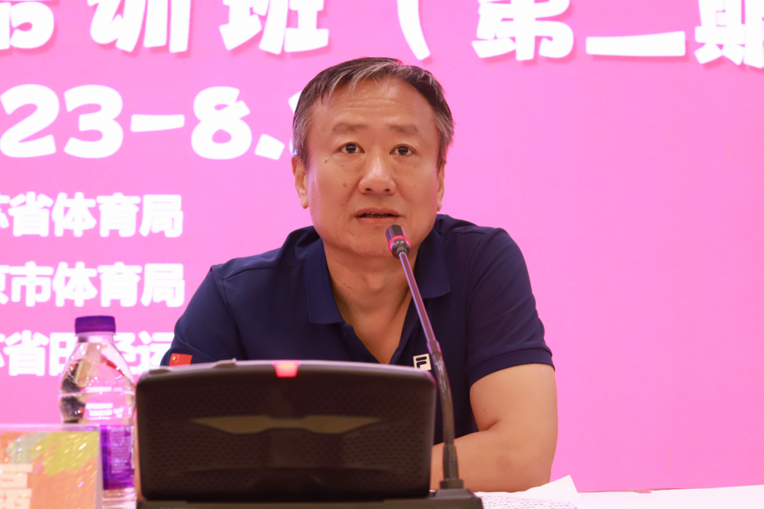 南京市体育局竞体处处长 聂磊致欢迎词,聂处长表示,田径是运动之母,幼儿趣味田径以游戏形式开展,以适合幼儿的运动器械为辅助工具,旨在激发儿童运动兴趣,增强儿童身体素质,发展儿童运动能力,建立儿童规则意识,培养积极进取、勇敢拼搏的精神,促进儿童身心和谐发展。希望学员们通过本次培训学习能够将趣味田径活动融入到园所一日活动当中去,促进幼儿在体育锻炼中享受乐趣、增强体质、健全人格、锤炼意志,培养德智体美劳全面发展的社会主义建设者和接班人。