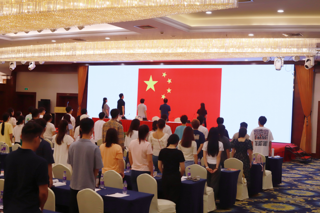 全体起立,面向国旗,奏唱国歌。
