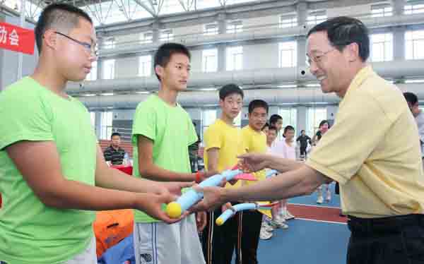 国际田联荣誉副主席楼大鹏先生为5支参赛队颁发国际田联少儿趣味田径标准器械