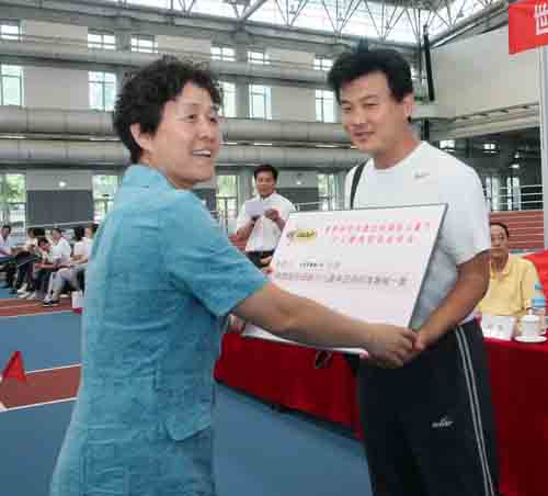 国家体育总局田径运动管理中心副主任、中国田径协会副主席周冰冰女士为参加活动的学校领导颁发器械捐赠证书