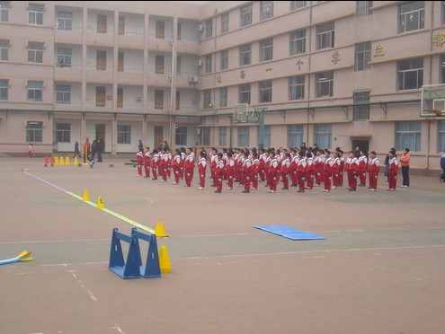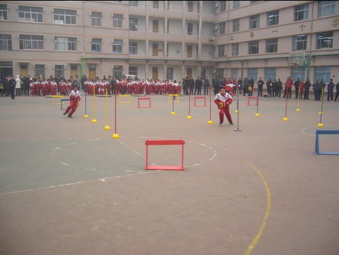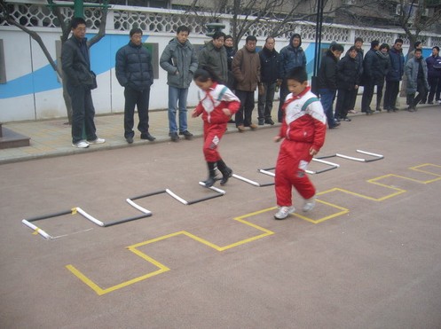 图4-7为:在济南洪家楼小学举行的国际田联少儿趣味田径项目展示活动