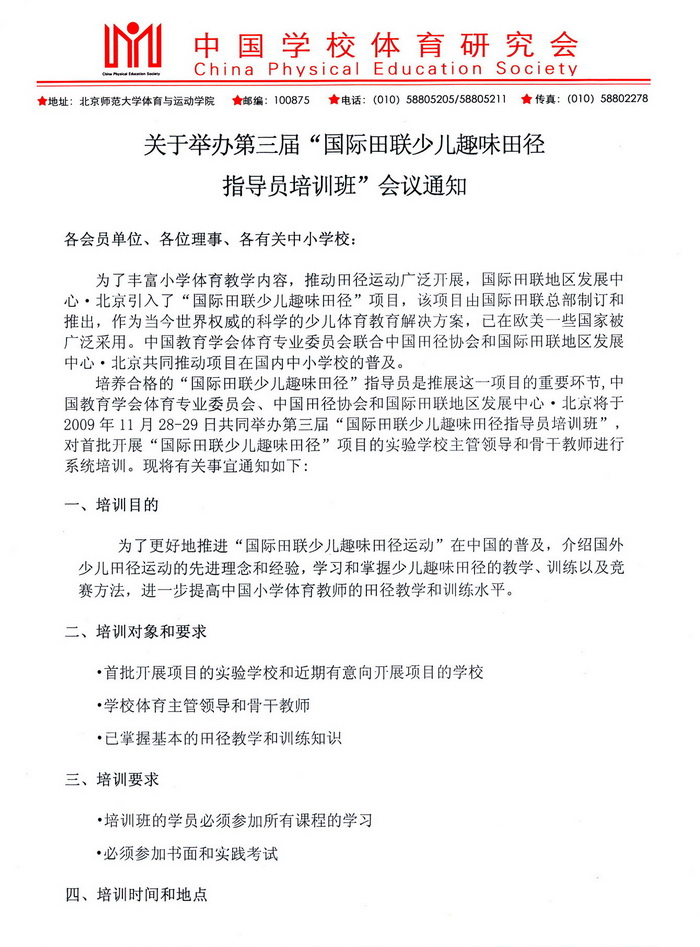 第三届国际田联少儿趣味田径指导员培训班会议通知