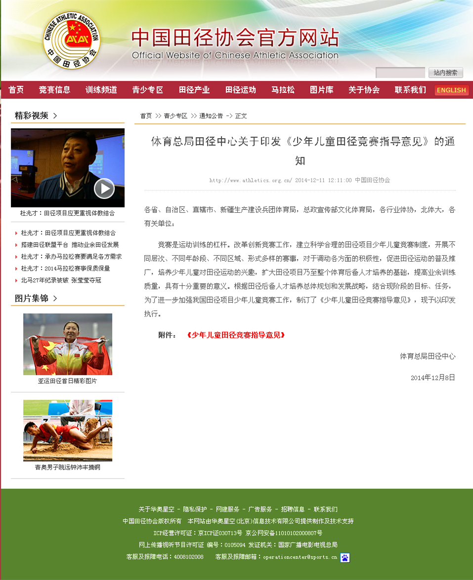 国家体育总局官方网站《少年儿童田径竞赛指导意见》通知网页链接:www.athletics.org.cn/youth/tzgg/2014-12-11/457598.html