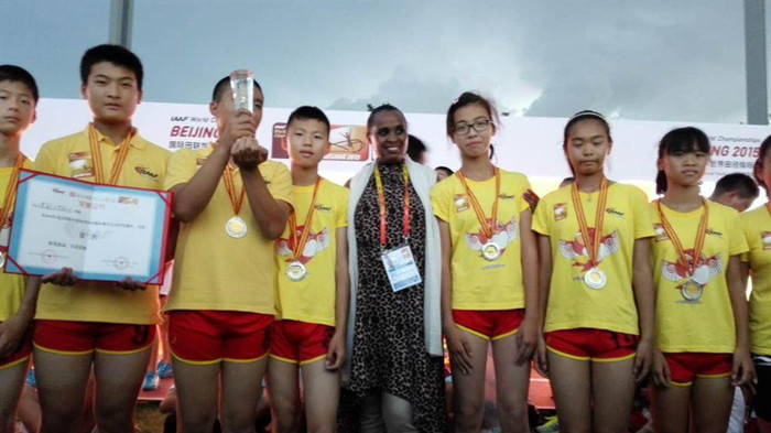 经过决赛的紧张、激烈的拼搏,在6个单项中,以3个第一,1个第三,2个第四,总分34分获得本次比赛团体总分第二名,(第一名:深圳荔园小学35分)。圆了紫微田径人的梦想,赛后,国际田联少儿田径推广部主任埃利斯为获奖小选手颁奖并合影。