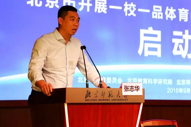 接下来,北京市教育委员会体卫艺处干部张志华发表讲话。首先,张志华根据国办发〔2016〕27号文件说到近几年下发的几个国家层面的文件,强调了国家对学校体育工作的重要程度。然后,介绍了北京市教委刘宇辉主任提出的“做大体育”。这个体育,指的不仅仅是体育教学,而是我们德智体美四育发展当中的一育。大体育,不仅从教学方面,我们还需要建设体育文化,创建体育氛围,完善体育管理,我们的体育不仅仅有体育老师,应该有我们每一个教育者、每一个教育管理者和教育实施者的参与。另外,张志华老师强调学校体育的任务是让学生强健体魄、学会运动技能,进而培养健全的人格。最后,提出38所试点学校在此项目发展过程中,有任何困难和问题,要积极和北师大专家团队进行沟通,积极和教研员进行沟通,积极跟教育主管部门进行沟通,各个部门齐心协力,把这项改革工作做好。