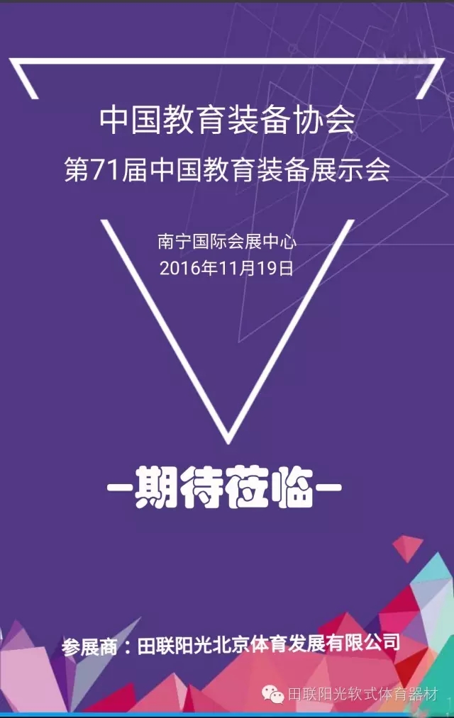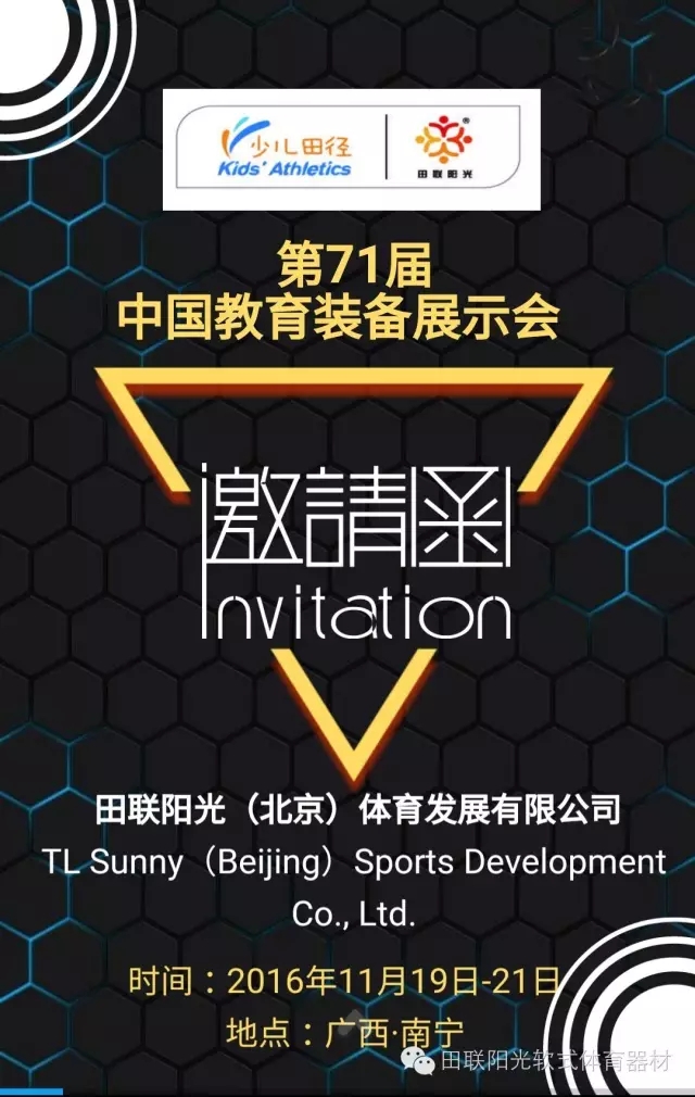 田联阳光(北京)体育发展有限公司将携教育部最新颁布的《中小学体育器材设施配备标准》要求配备器材“少儿趣味田径成套软式器材”亮相第71届中国教育装备展 ,期待您的莅临参观!