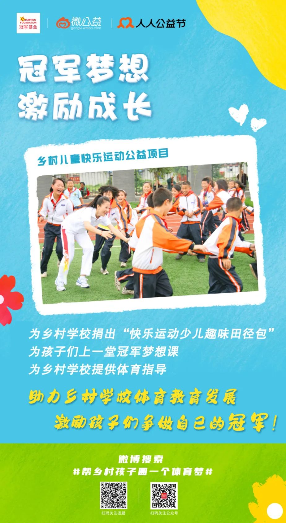 “冠军梦想·激励成长——乡村儿童快乐运动项目”发起开学季专项公益行动。为此,冠军基金邀请广大优秀运动员朋友担任该项目“快乐运动公益大使”志愿者,与冠军基金一起为乡村学校捐出“快乐运动少儿趣味田径包”