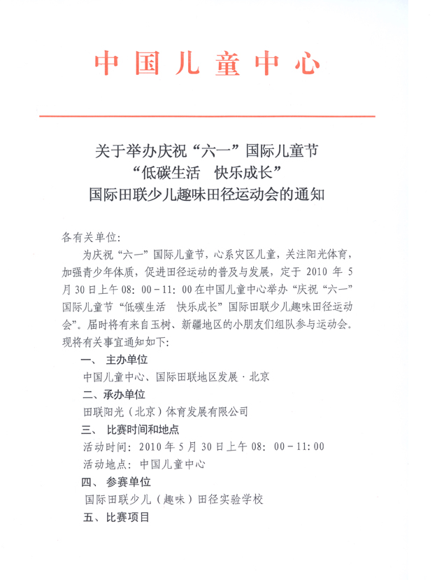 2010年5月20日-23日国际田联少儿趣味田径项目将参加在北京国际展览中心举行的第26届体育用品博览会,我们将借助这个亚太地区规模最大,最具权威性的体育用品专业平台向全亚洲展示和推广“少儿趣味田径”项目,欢迎对项目感兴趣的各界人士届时莅临参观指导。
