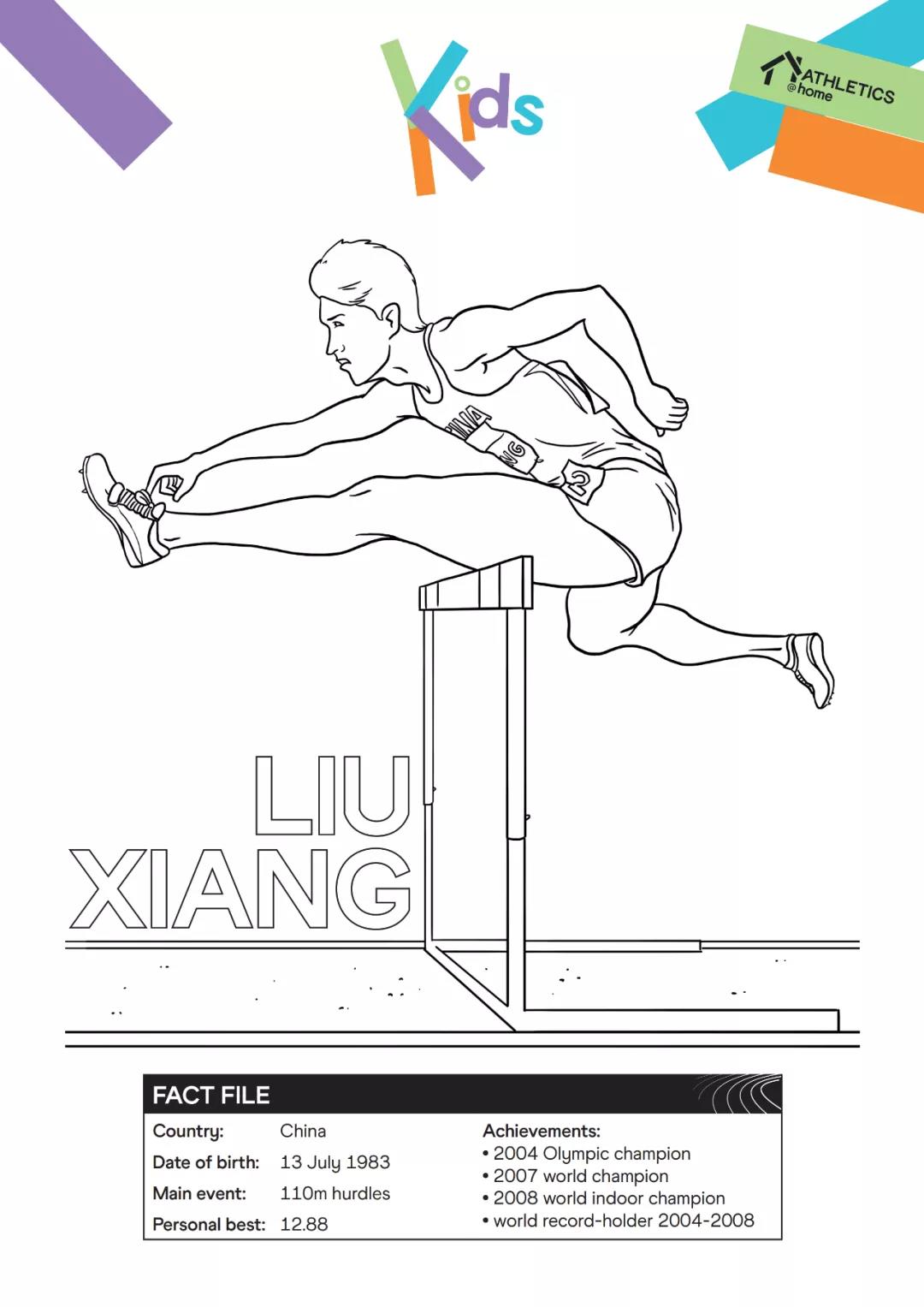 小朋友们,你们有蜡笔或者水彩笔吗?让我们来涂色并了解一些伟大的体育明星吧。首先,是中国110米跨栏冠军刘翔和澳大利亚400m体育明星凯茜.弗里曼。人物档案:刘翔国籍:中国出生日期:1983年7月13日