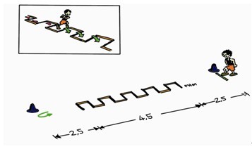 地板上放置着一个规则的梯子,在梯子的两端放置着两个锥形记号桶,准备起跑的时候,要求参赛者站在起跑线上。在发令开始之后,参赛者跑向梯子,尽可能快地有节奏地跑过那张梯子而达到梯子另一端的第二个标志桶他/她跑过梯子并绕过标志桶之后,参赛者应当快速地通过梯子再跑回出发端的第一个标志桶。与下一队员接力,依次进行,所有人完成一次,比赛结束。